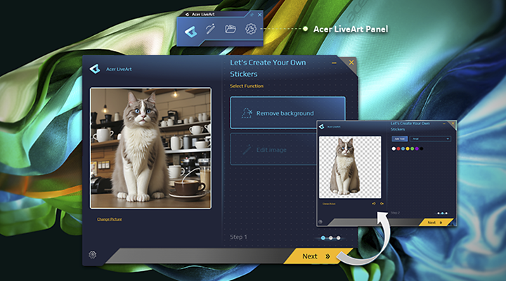 Премахвайте мигновено фонове от изображения с Acer LiveArt™. Редактирайте и създавайте етикети за поставяне навсякъде и когато правите екранна снимка или отваряте изображение, екранът на менюто изскача интуитивно за съдействие.