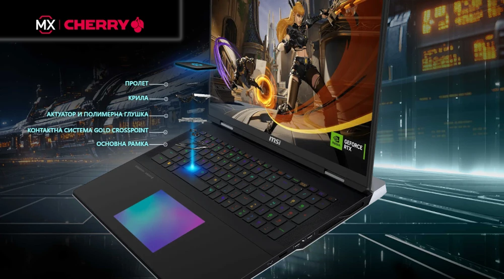 Насладете се на тактилна обратна връзка. Titan 18 HX AI идва с уникална механична клавиатура Cherry MX Ultra-Low Profile, пригодена за лаптопи с ултра-тънък дизайн. Клавиатурата включва структура от две части на капачката на клавишите и златиста контактна система с кръстосани точки, които създават задоволително тактилно усещане и прецизно задействане на клавишния превключвател