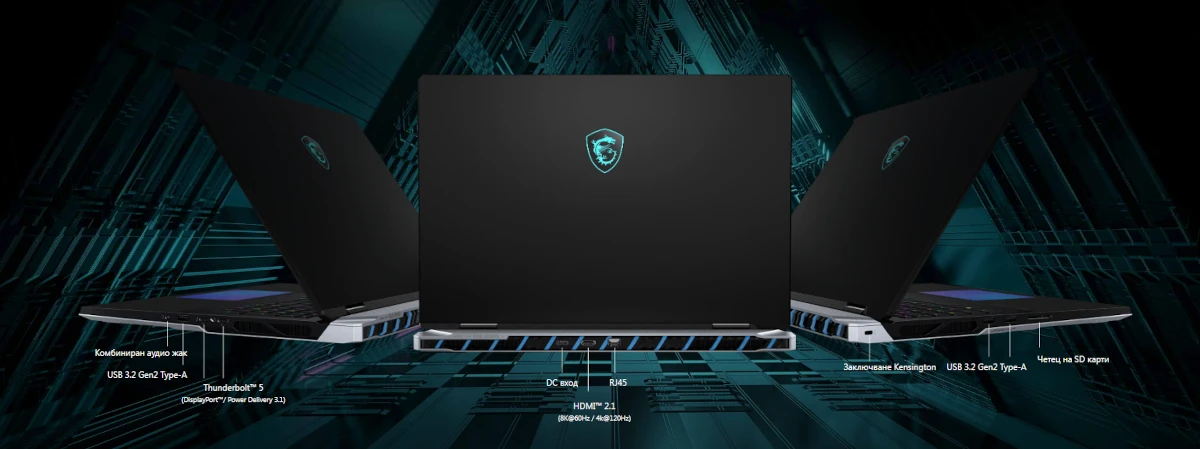 Titan 18 HX AI е оборудван с широк набор от входно/изходни портове, осигуряващи свързаност на ниво десктоп за безпроблемно предаване на данни и гъвкав изход на дисплея. Това гарантира на геймърите максимална гъвкавост на устройството, когато използват лаптопа.