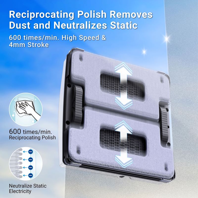 HOBOT-S6 Pro идва с революционна двойна полираща функция. Това е първият робот за почистване на прозорци на пазара, който почиства с две почистващи кърпи с възвратно-постъпателно движение. Тази уникална функция спомага по-ефективното почистване на прозореца, но и неутрализира статичното електричество, като гарантира, че прозорците ще остават чисти и светли за по-дълъг период от време.