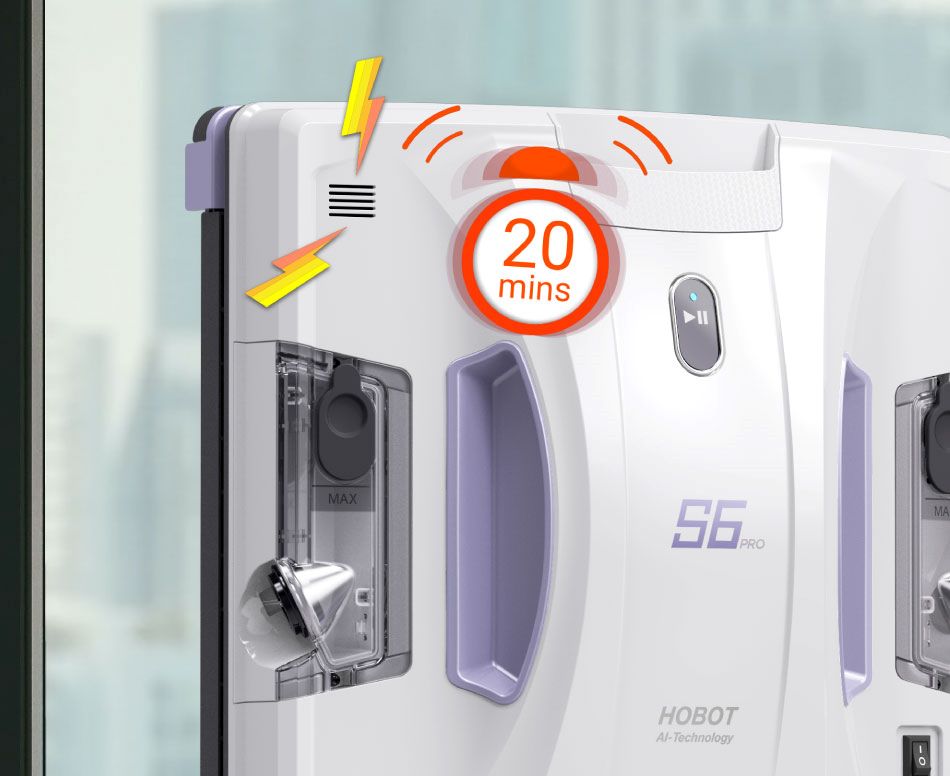 В случай на прекъсване на захранването, вградената система за непрекъсваемо захранване (UPS) поддържа HOBOT в позиция за 20 минути с непрекъснат звуков сигнал.