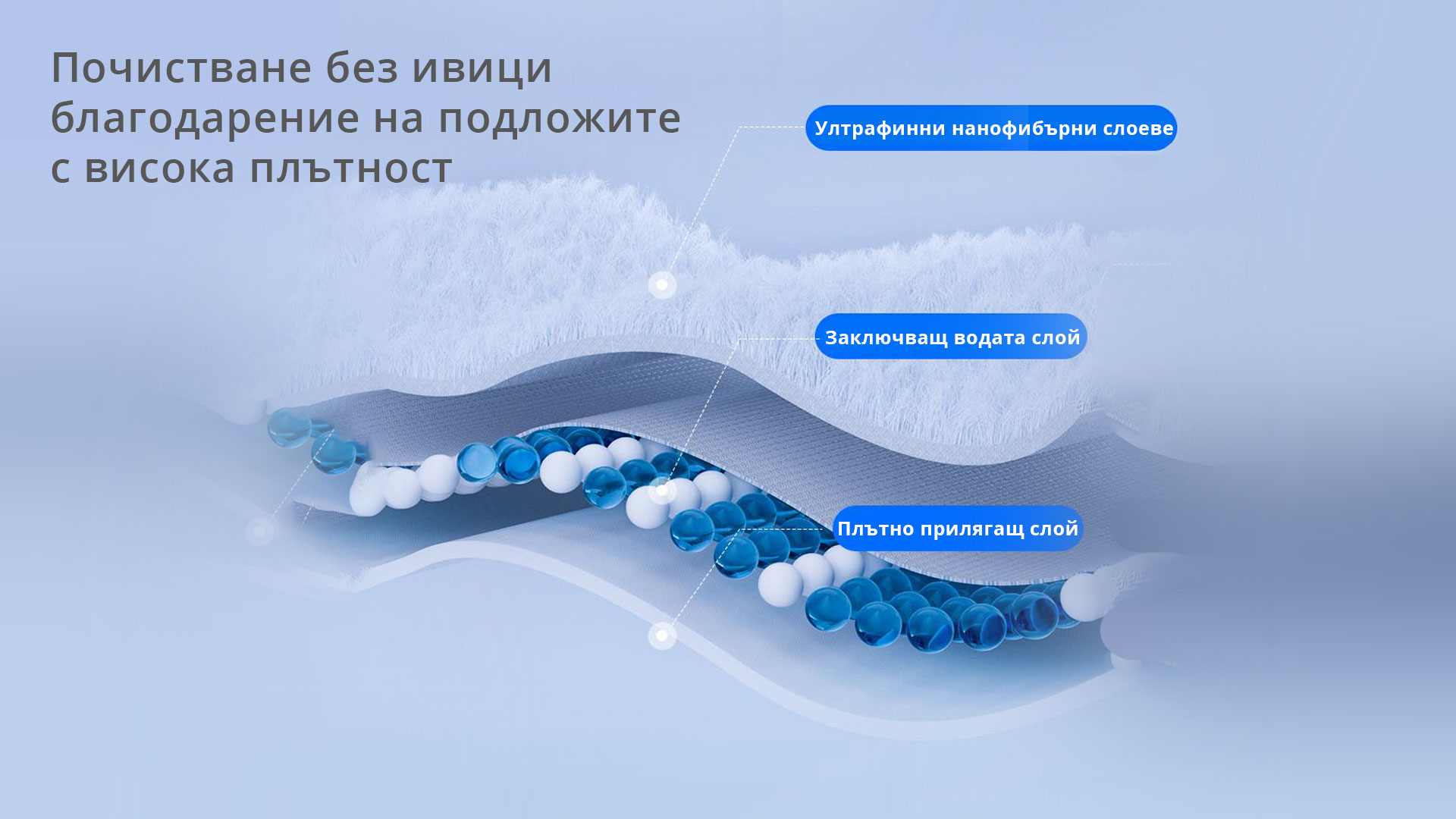 Високоабсорбиращият моп следва дизайна на робота и той е изключително плътен. Състои се от три слоя, като първият е направен от микрофибър, изцяло от нанофибри - меки и нежни, подходящи за всякакъв вид повърхности - гладки, матови, релефни. Вторият слой служи за абсорбиране и задържане на водата, докато третият е непропусклив и устойчив.