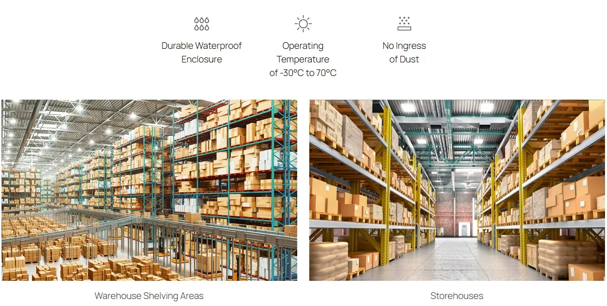 - Идеален за складове и открити пространства: Разполага с IP68 водоустойчив корпус с работен температурен диапазон от -30°C до +70°C.