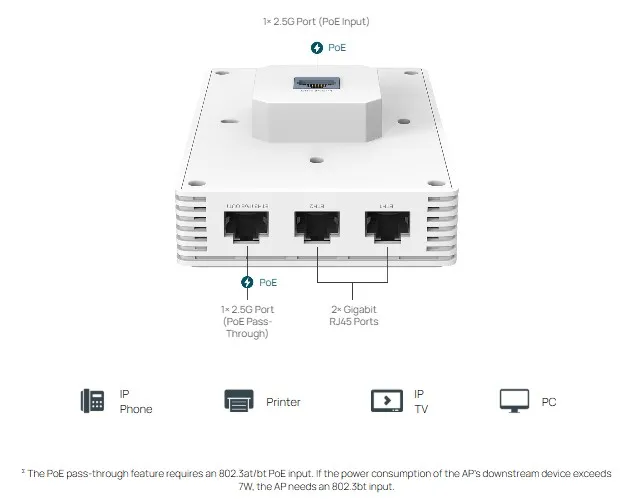 С 2.5G PoE входящ и проходен порт, както и два гигабитови RJ45 порта, се осигурява високоскоростен трансфер на данни и възможност за свързване на множество устройства към гигабитовата ви мрежа. Кабелните устройства, като IP телефони, могат да се захранват без нужда от допълнителни електрически кабели.