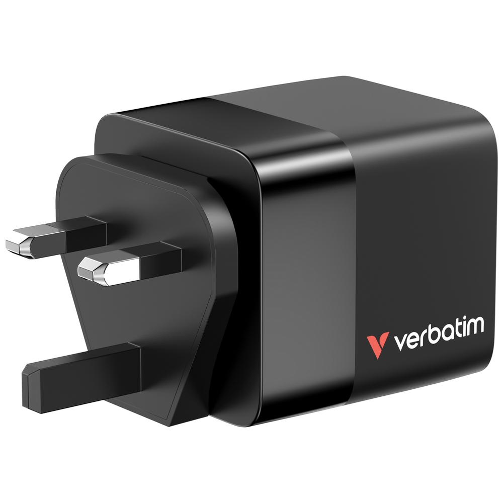 Verbatim Mini GaN Charger 65W 2 Port retractable cable display US plugs with EU and UK adaptors - 32217