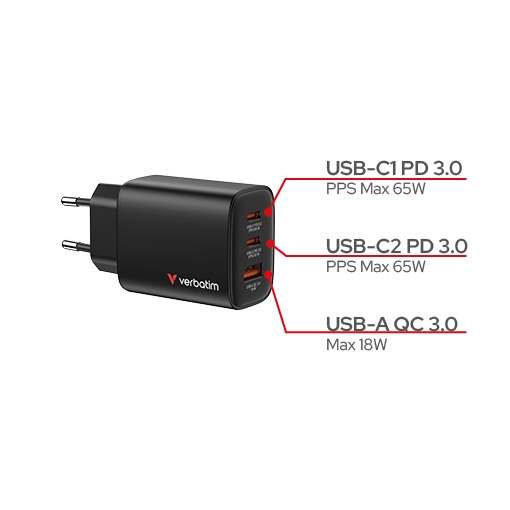 | Мощност, W: | Total Output: 65W max, USB-C PD 3.0 Ports: 2x USB-C (up to 65W), USB-A QC 3.0 Port: 1x USB-A (up to 18W) |