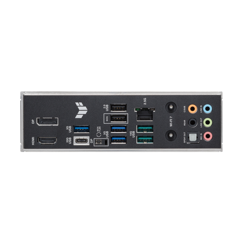 | I/O: | 1 x USB 20Gbps port (1 x USB Type-C® with DP Alt mode), 2 x USB 10Gbps ports (2 x USB Type-A), 3 x USB 5Gbps ports (3 x Type-A), 2 x USB 2.0 ports (2 x Type-A), 1 x DisplayPort, 1 x HDMI™ port, 1 x Wi-Fi module, 1 x Realtek 2.5Gb Ethernet port, 5 x Audio jacks, 1 x Optical S/PDIF out port, 1 x BIOS FlashBack™ button, 1 x USB 20Gbps port (1x USB Type-C® with DP Alt mode), 2 x USB 10Gbps ports (2 x USB Type-A), 3 x USB 5Gbps ports (3 x Type-A), 2 x USB 2.0 ports (2 x Type-A), 1 x DisplayPort, 1 x HDMI™ port, 1 x Wi-Fi module, 1 x Realtek 2.5Gb Ethernet port, 5 x Audio jacks, 1 x Optical S/PDIF out port, 1 x BIOS FlashBack™ button |