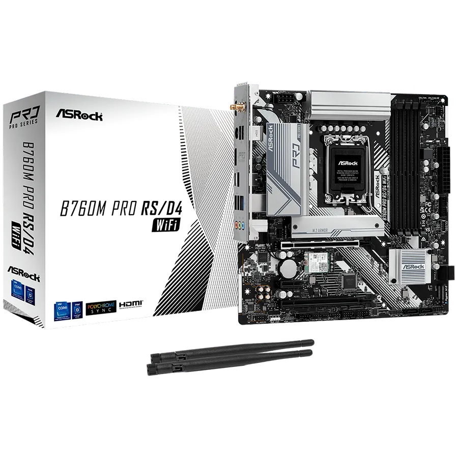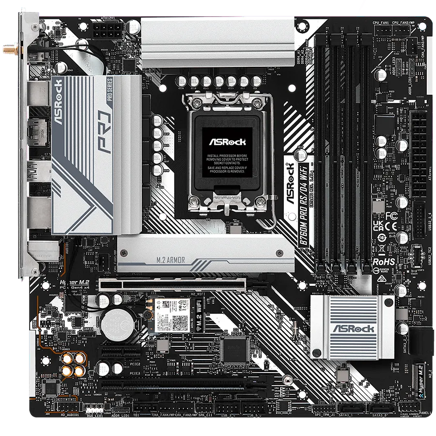 ASROCK MB Desktop B760M Pro RS Wi-Fi (S1700, 4x DDR4, 2x PCIe 4.0 x16, 1x PCIe 4.0 x1, 1x Hyper M.2 PCIe Gen4x4, 4x SATA3, 2x USB-C, 5x USB 3.2, 6x USB 2.0, 1xRJ-45 2.5GB, 2x 802.11ax Wi-Fi, 1x HDMI, 1x DP, 7.1 HD Audio, micro ATX. - B760M PRO RS/D4 WIFI