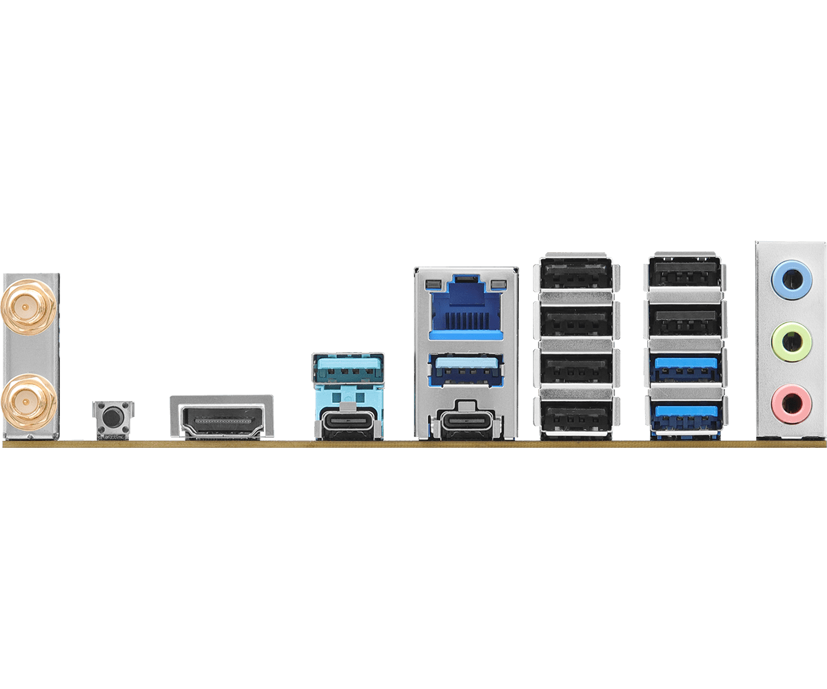 | I/O: | 2 x Antenna Ports, 1 x HDMI Port, 1 x USB 3.2 Gen2 Type-C Port (10 Gb/s), 1 x USB 3.2 Gen1 Type-C Port (DP-alt mode supports DP1.4a), 4 x USB 3.2 Gen1 Type-A Ports, 6 x USB 2.0 Ports, 1 x RJ-45 LAN Port, 1 x BIOS Flashback Button, HD Audio Jacks: Line in / Front Speaker / Microphone |