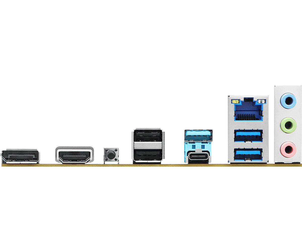 | I/O: | 2 x Antenna Mounting Points, 1 x HDMI Port, 1 x DisplayPort 1.4, 1 x USB 3.2 Gen1 Type-C Port, 3 x USB 3.2 Gen1 Type-A Ports, 2 x USB 2.0 Ports, 1 x RJ-45 LAN Port, 1 x BIOS Flashback Button, HD Audio Jacks: Line in / Front Speaker / Microphone |