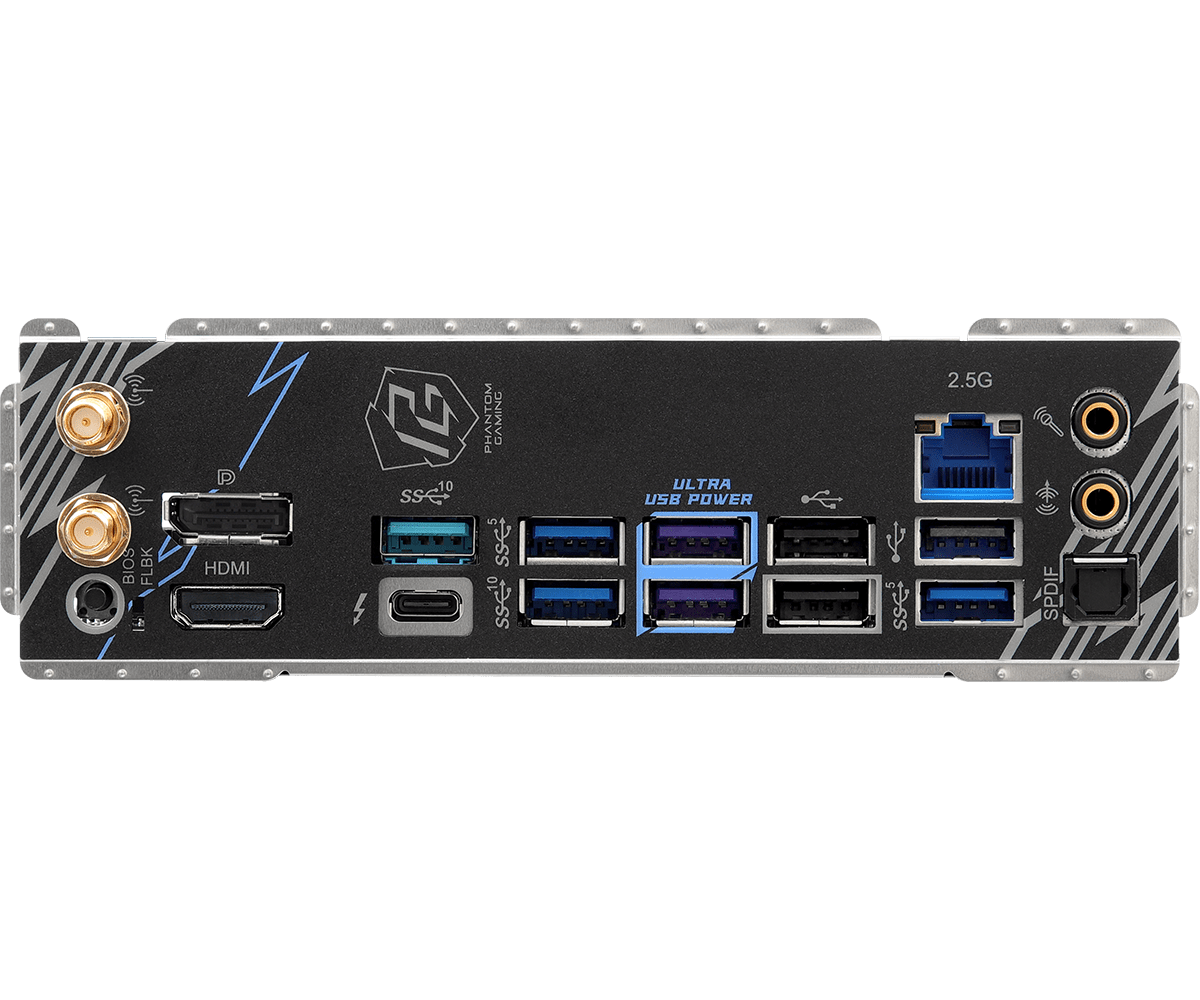 | I/O: | 2 x Antenna Ports, 1 x HDMI Port, 1 x DisplayPort 1.4, 1 x Optical SPDIF Out Port, 1 x Thunderbolt™ 4 Type-C Port (40 Gb/s for USB4 protocol, 40Gb/s for Thunderbolt™ protocol), 2 x USB 3.2 Gen2 Type-A Ports (10 Gb/s), 4 x USB 3.2 Gen1 Ports, 3 x USB 2.0 Ports, 1 x RJ-45 LAN Port, 1 x BIOS Flashback Button, 1 x Line Out Jack (Gold Audio Jack), 1 x Microphone Input Jack (Gold Audio Jack) |
