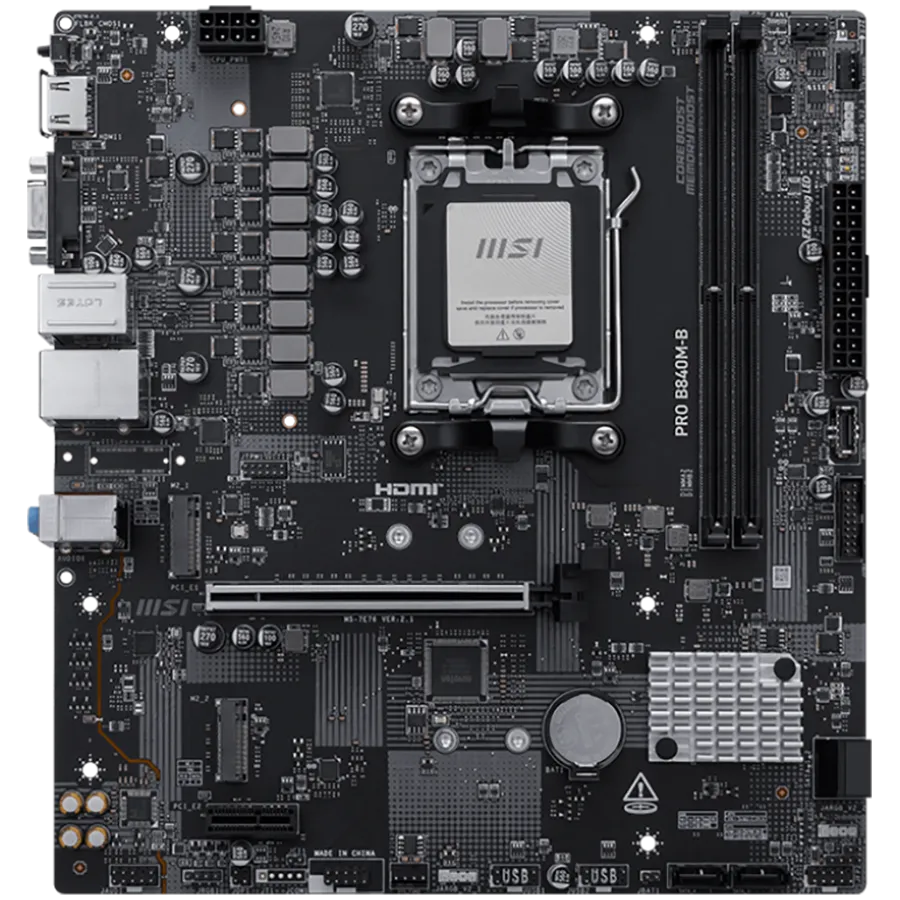 MSI PRO B840M-B, mATX, Socket AM5, 2x DDR5 Dual Channel DDR5 up to 8000(OC)MHz, 1x PCIe x16 slot, 2x M.2 slot, 2x USB 2.0, 4x USB 5Gbps, HDMI, VGA, 7.1 HD Audio, 2.5G LAN, 3Y - PRO_B840M-B
