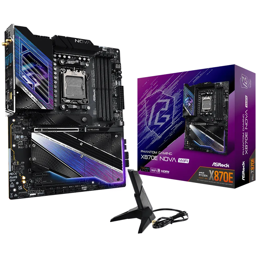 ASROCK MB Desktop X870E Nova Wi-Fi, AM5, 4x DDR5, 1x PCIe 5.0 x16, 1x PCIe 3.0 x1, 1x PCIe 3.0 x16, 1x Blazing M.2(PCIe Gen5x4), 3x Hyper M.2, 1x Ultra M.2, RAID 0, 1, 10, 4x SATA3 6.0 Gb/s, 3x USB-C, 12x USB 3.2, 6x USB 2.0, 1x SPDIF, 7.1 CH Audio, 1x HDMI, 1x 5G LAN, 802.11be 2x Wi-Fi 7 + BT 5.4 - X870E NOVA WIFI