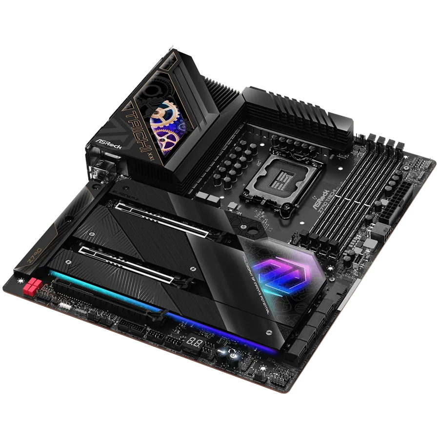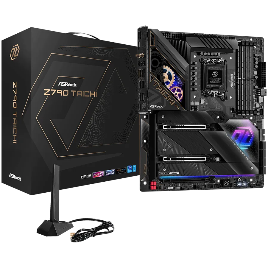 ASROCK MB Desktop Z790 Taichi, S1700, 4x DDR5, 2x PCIe 5.0 x16, 1x PCIe 4.0 x16, 4x Hyper M.2, 1x Blazing M.2, 1x Hyper M.2, 8x SATA3, 3x USB-C, 12x USB 3.2, 6x USB 2.0, 1x RJ-45 2.5GB Lan, 802.11ax Wi-Fi 6E + BT 5.3, 1x HDMI, 1x SPDIF, ATX