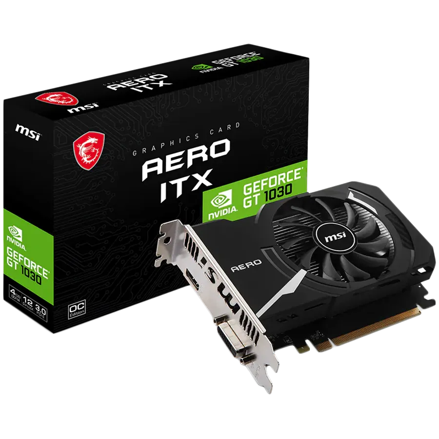 MSI Video Card Nvidia GeForce GT 1030 AERO ITX 4GHD4 OC, 4GB DDR4, 64-bit, 2100MHz Memory Speed, 1430MHz Boost, 384 CUDA Cores, 1x DVI-D, HDMI 2.1, 300W Recommended PSU, 3Y - GT_1030_AERO_ITX_4GD4_OC