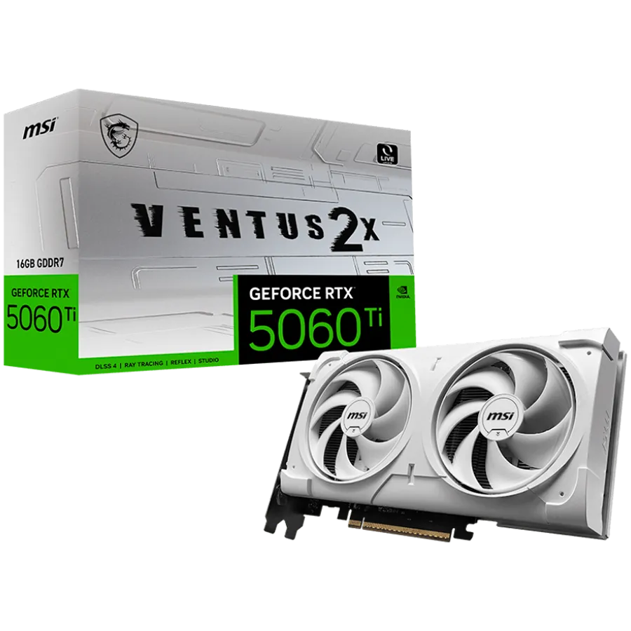 MSI Video Card NVIDIA GeForce RTX 5060 Ti 16G VENTUS 2X WHITE PLUS, 16GB GDDR7, 128-bit, 2587 MHz Boost, 4608 CUDA Cores, PCIe 5.0 (x8), 3x DP 2.1b, HDMI 2.1b, RAY TRACING, Dual Fan, 180W TDP, 8-pin PCIe Power, G-SYNC, 2-Slot, 3Y - RTX_5060_TI_16G_VENTUS_2X_WHITE_PLU