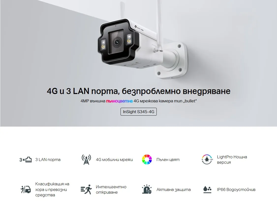 4MP Външна пълноцветна 4G мрежова булет камера TP-Link VIGI InSight S345-4G