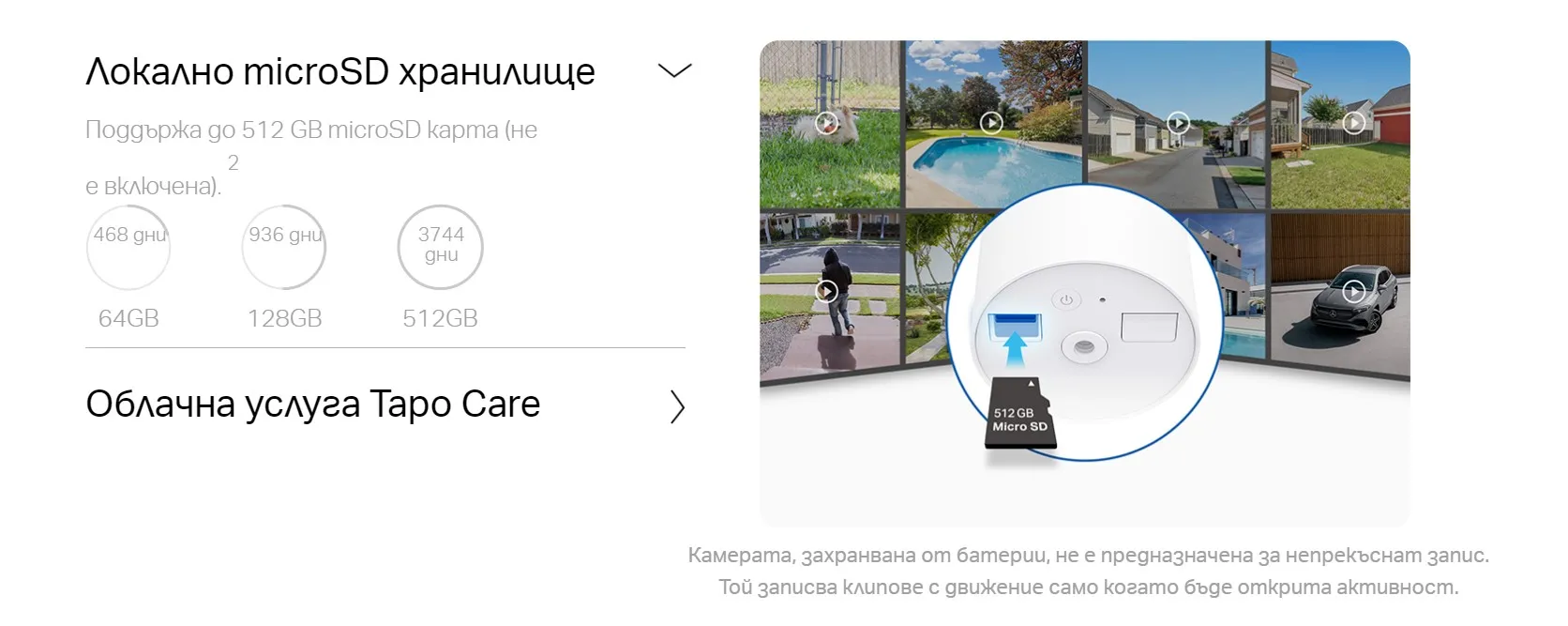 - Гъвкави опции за съхранение: Изберете от локално microSD хранилище до 512 GB или защитената облачна услуга Tapo Care за допълнително спокойствие.