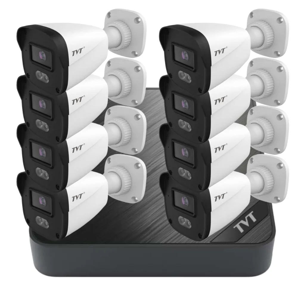 Комплектът за Видеонаблюдение от TVT включва 8 броя Висококачествени IP POE видеокамери с Резолюция 2 мегапиксела(FULL HD) и нощно виждане до 20 метра. Камерите са с 2.8 мм обектив и осигуряват ясно изображение с хоризонтален ъгъл на видимост 93°. Те са предназначени за външен и вътрешен монтаж, благодарение на UV защитения PVC корпус и IP66 водоустойчивият си корпус, гарантиращи тяхната издръжливост на атмосферни условия.