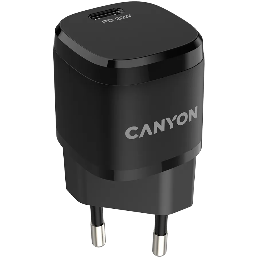 CANYON H-20-05, PD 20W Input: 100V-240V, Output: 1 port charge: USB-C:PD 20W (5V3A/9V2.22A/12V1.66A) , Eu plug, Over- Voltage , over-heated, over-current and short circuit protection Compliant with CE RoHs,ERP. Size: 68.5*29.2*29.4mm, 32.5g, Black - CNE-CHA20B05