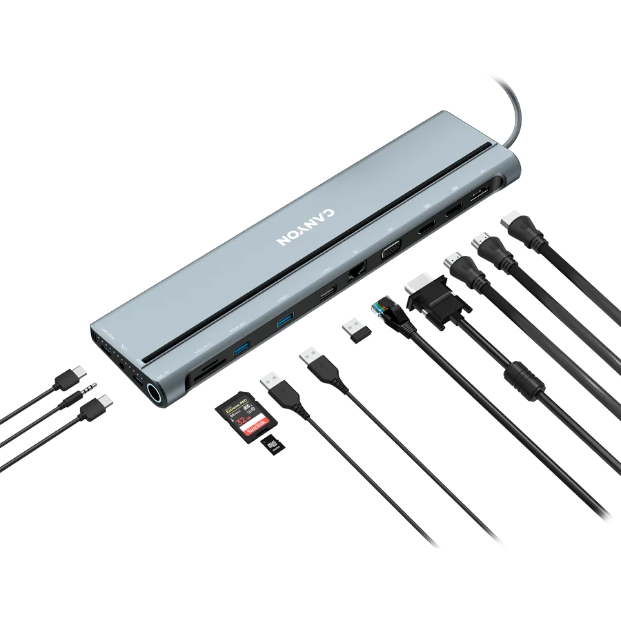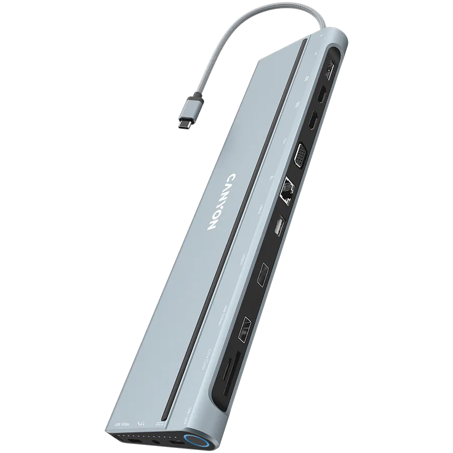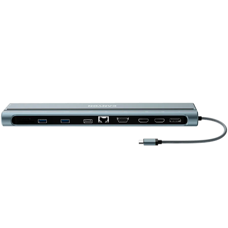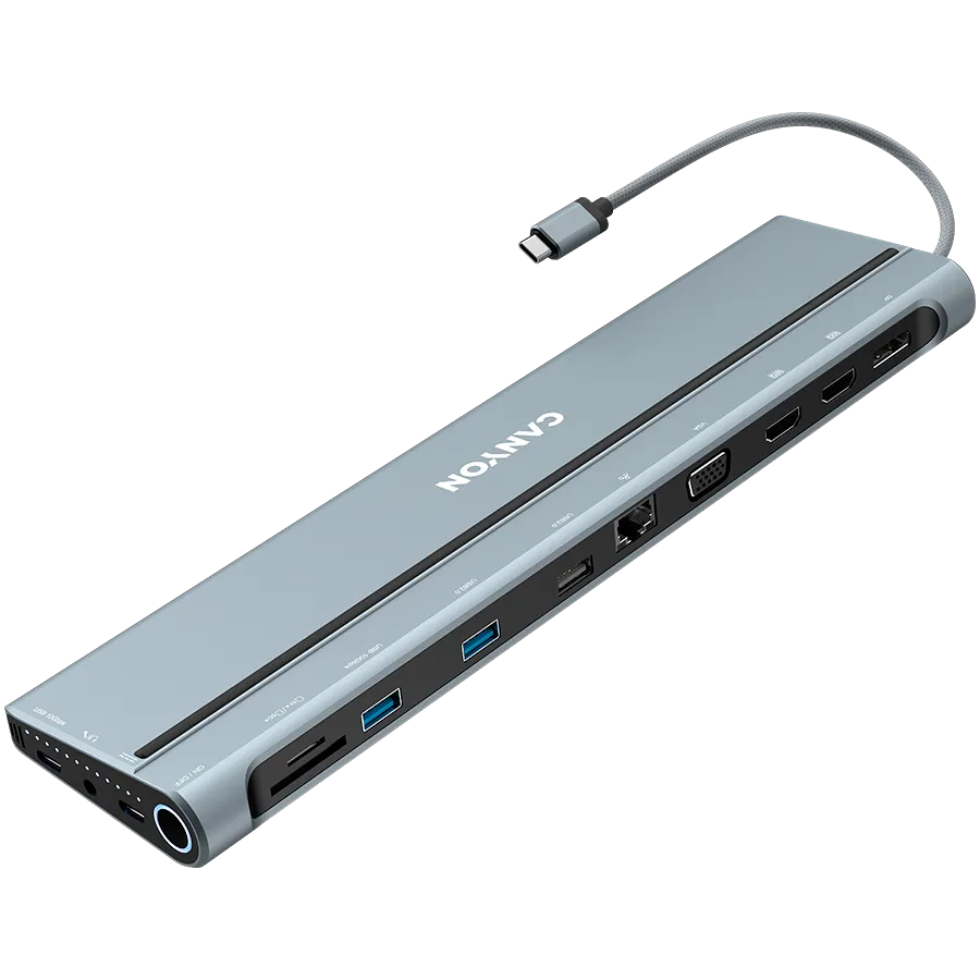 If your laptop is equipped with USB type-C, this universal docking station CNS-HDS90, which is the 3rd generation of the popular model, will improve its connectivity features with 14 built-in interfaces to the maximum. Using Display Port (4Kx60Hz), HDMI (2x4K UHD (60Hz) and VGA (up to 1080Px60 Hz), you can connect your laptop to four monitors simultaneously The up to 100W USB-C PD charging port allows you to charge your connected device at optimal speed. Also, the USB hub Canyon HDS90 has built-in 3.5mm audio jack for headphones/microphone, SD and TF card reader, Ethernet for flawless internet connection and USB-С 3.2 Gen 2 for fast data transferring. The Hub CNS-HDS90 for 14 interfaces will make your workspace look stylish and modern.