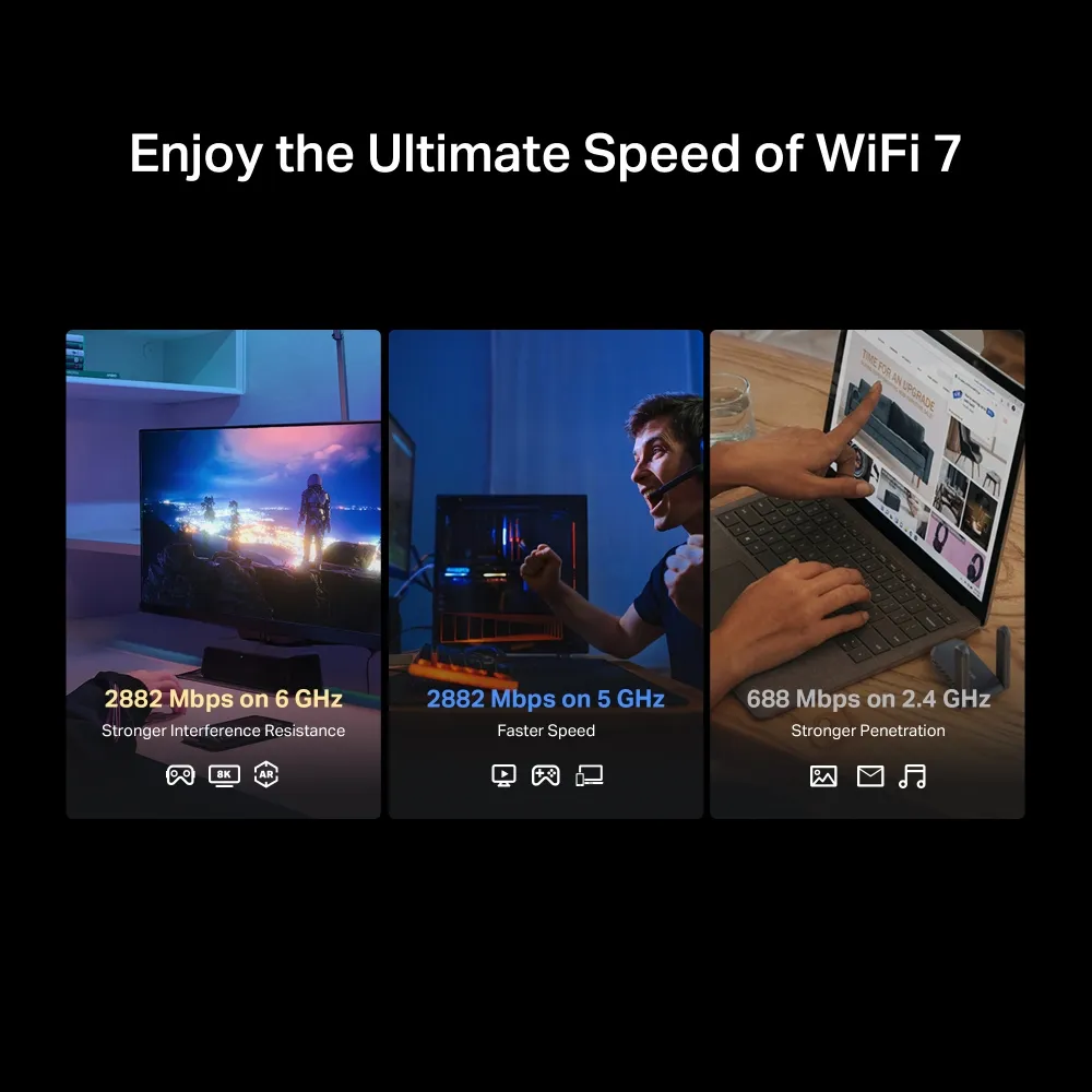 Висока трибандова WiFi скорост – Скорости до 2882 Mbps (6 GHz) + 2882 Mbps (5 GHz) + 688 Mbps (2.4 GHz).