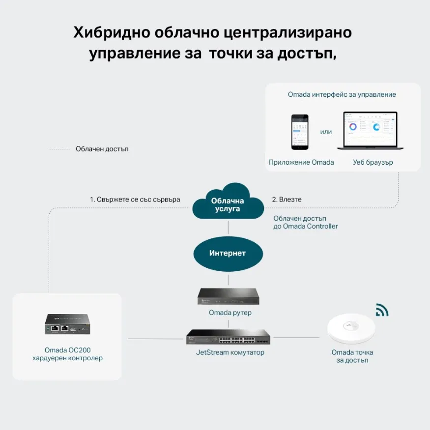 С хибридна облачна технология, Omada OC200 хардуерният контролер ви позволява да управлявате отдалечено цялата мрежа, където и да се намирате по света с облачен достъп. Управлявайте локално устройства с максимална сигурност и стабилност.