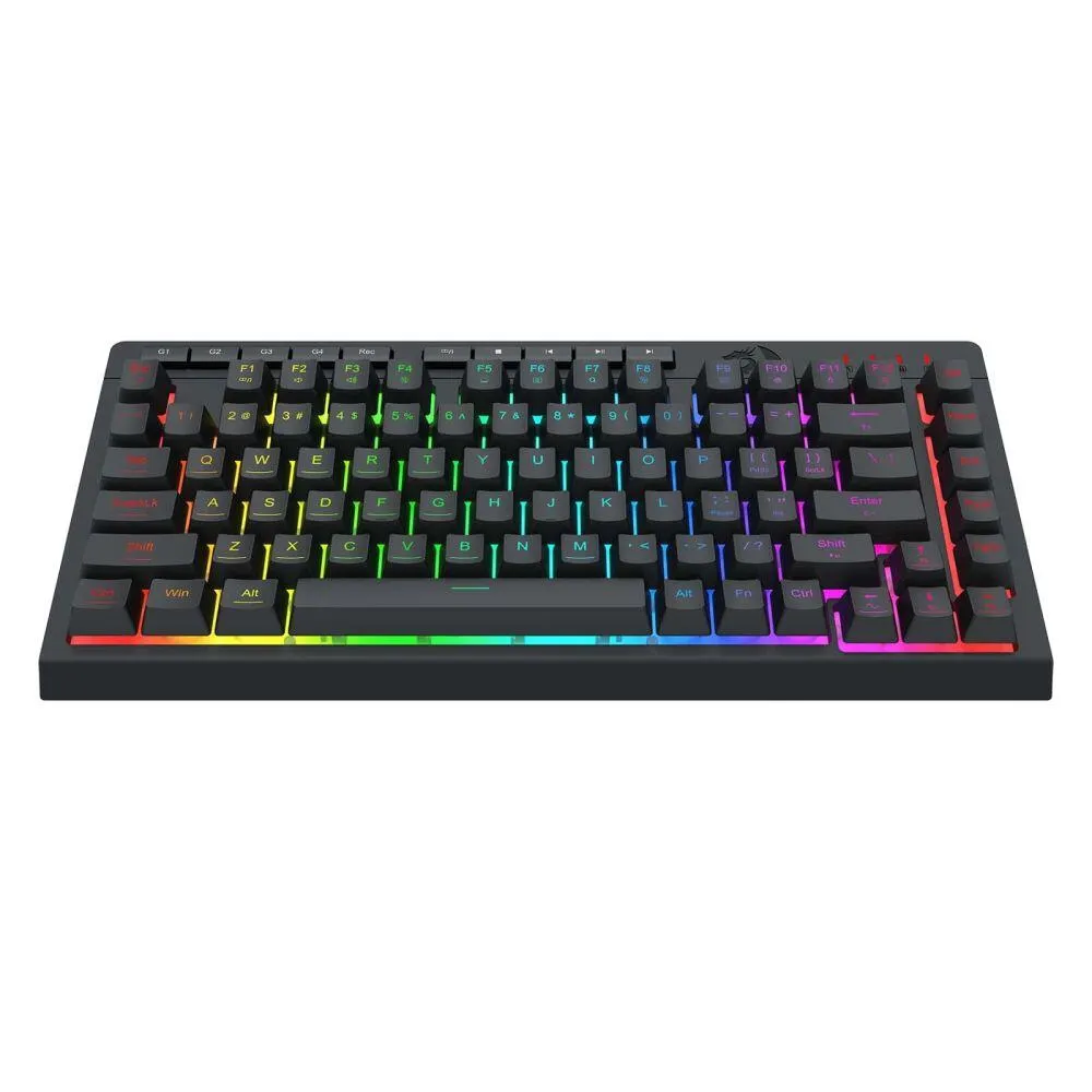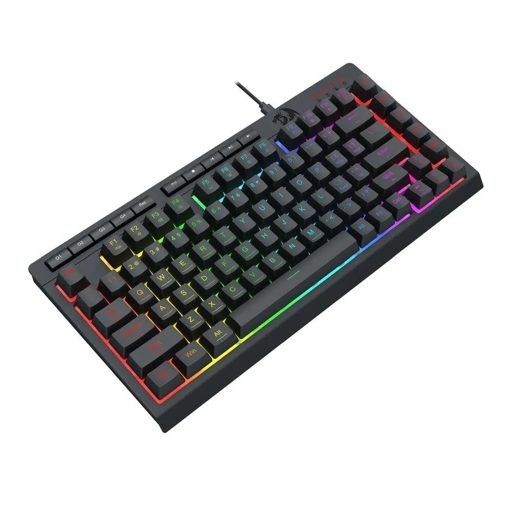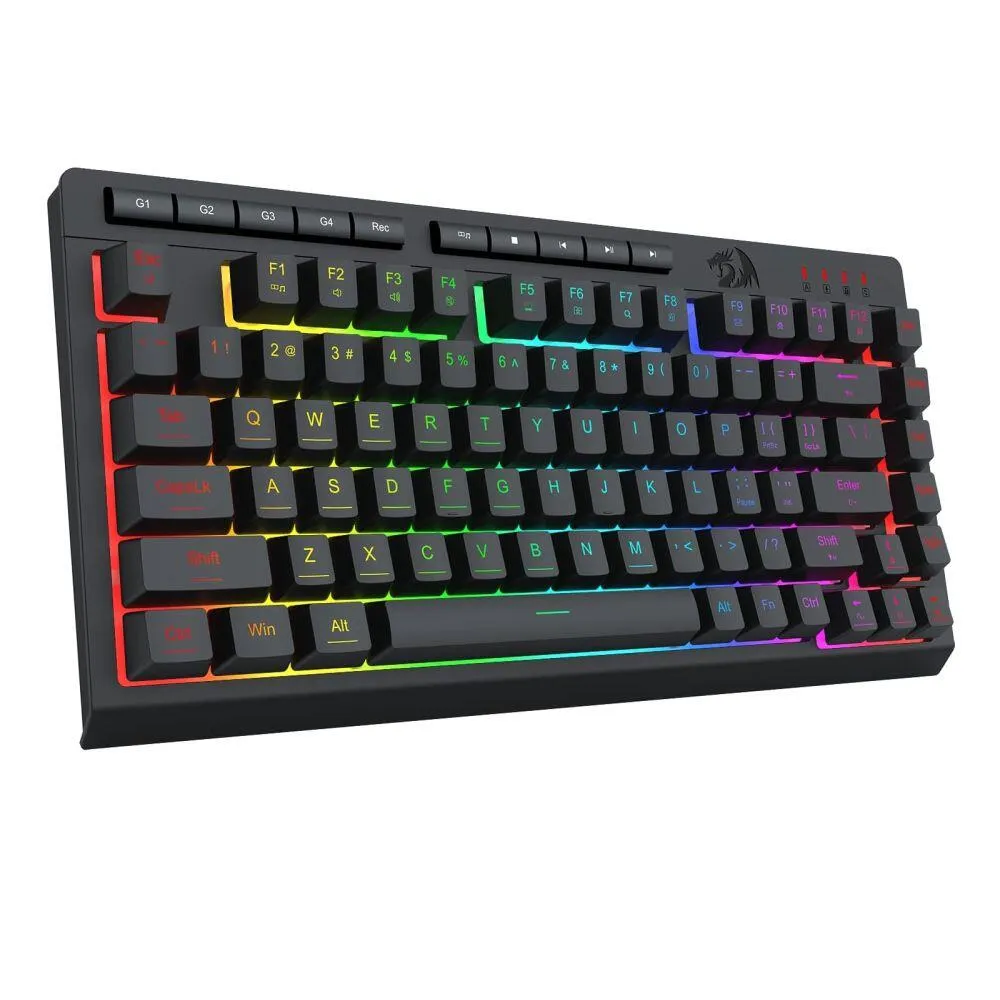 Redragon Crescent геймърска клавиатура, черна, с RGB подсветка, 82 клавиша, 26 conflict-free клавиша (26-key rollover), RGB LED подсветка на клавишите, 5 мултимедийни клавиша, 4 MACRO клавиша, възможност за деактивиране на WIN клавиш при игра, софтуер за конфигурация на клавиатурата, USB конектор, размери: 326 × 156 × 38 мм, тегло: 0.48 кг