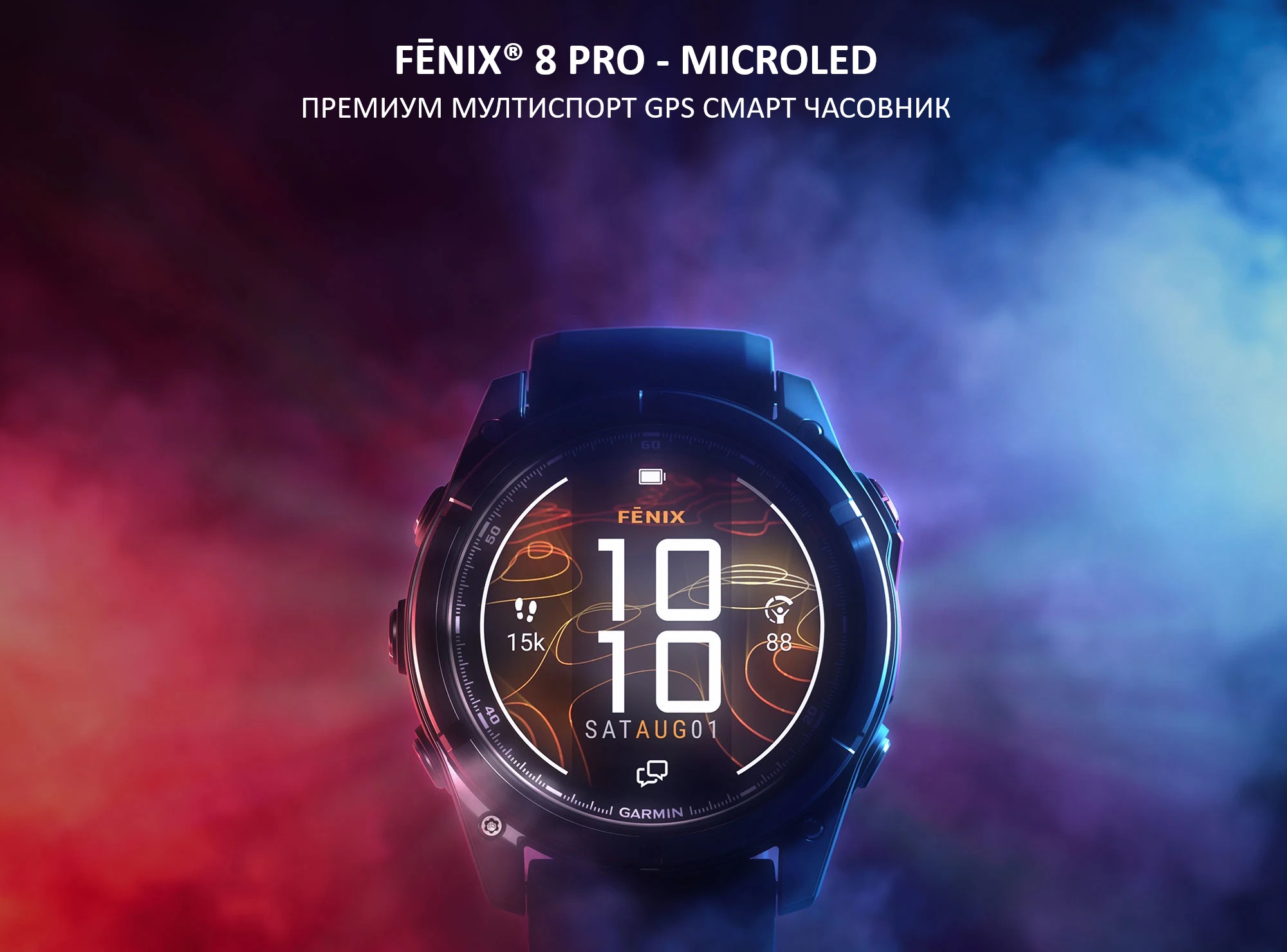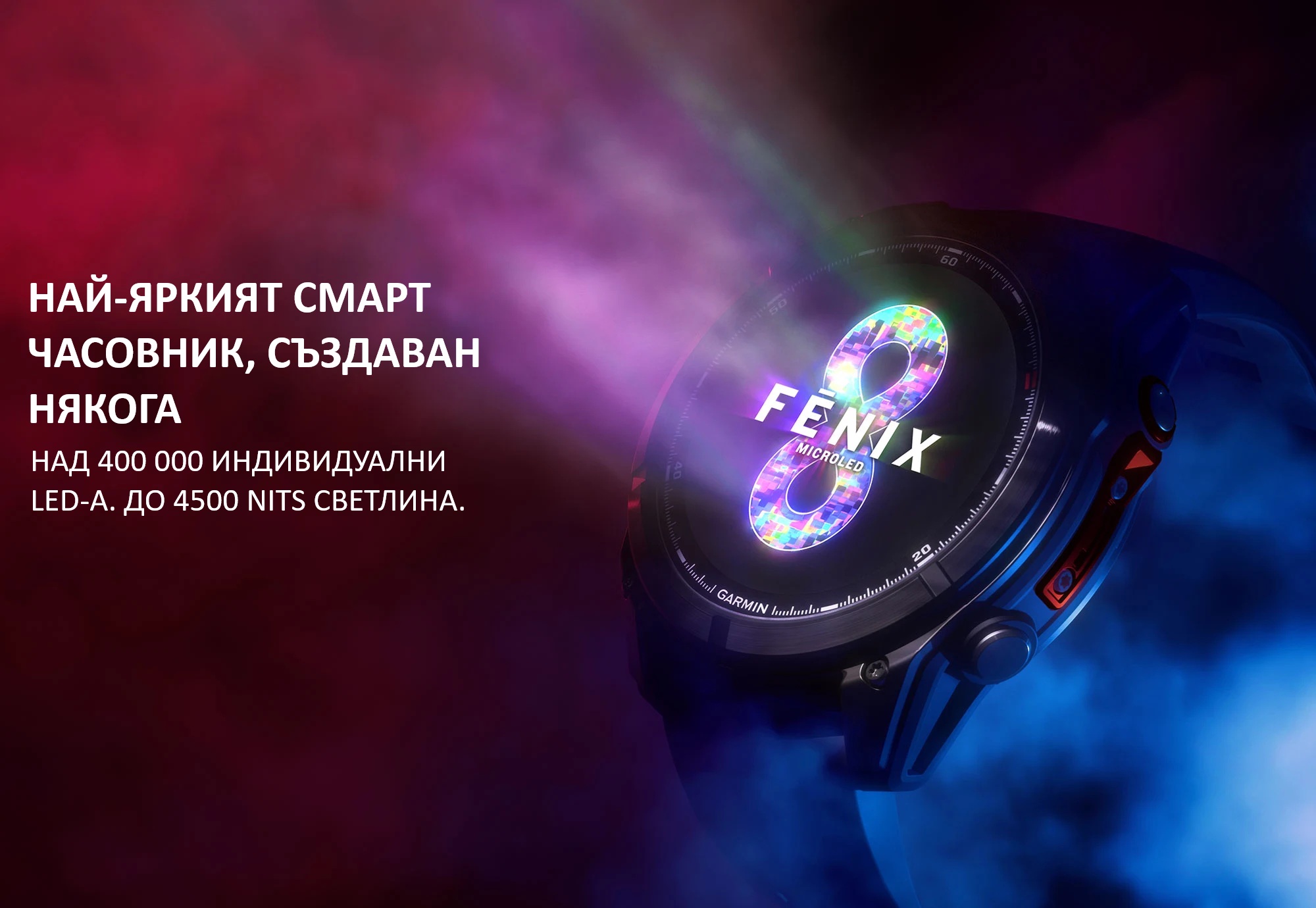 Това е първият смарт часовник с MicroLED дисплей. Предлагайки забележителна яркост и детайлност, fēnix® 8 Pro е проектиран за Вашия активен живот с технология inReach® за обаждания от китката1 ,съобщения, споделяне на местоположение и SOS поддръжка — плюс усъвършенствани инструменти за силови тренировки, навигация с карта и вградено фенерче, за да продължите приключенията си и след залез слънце.