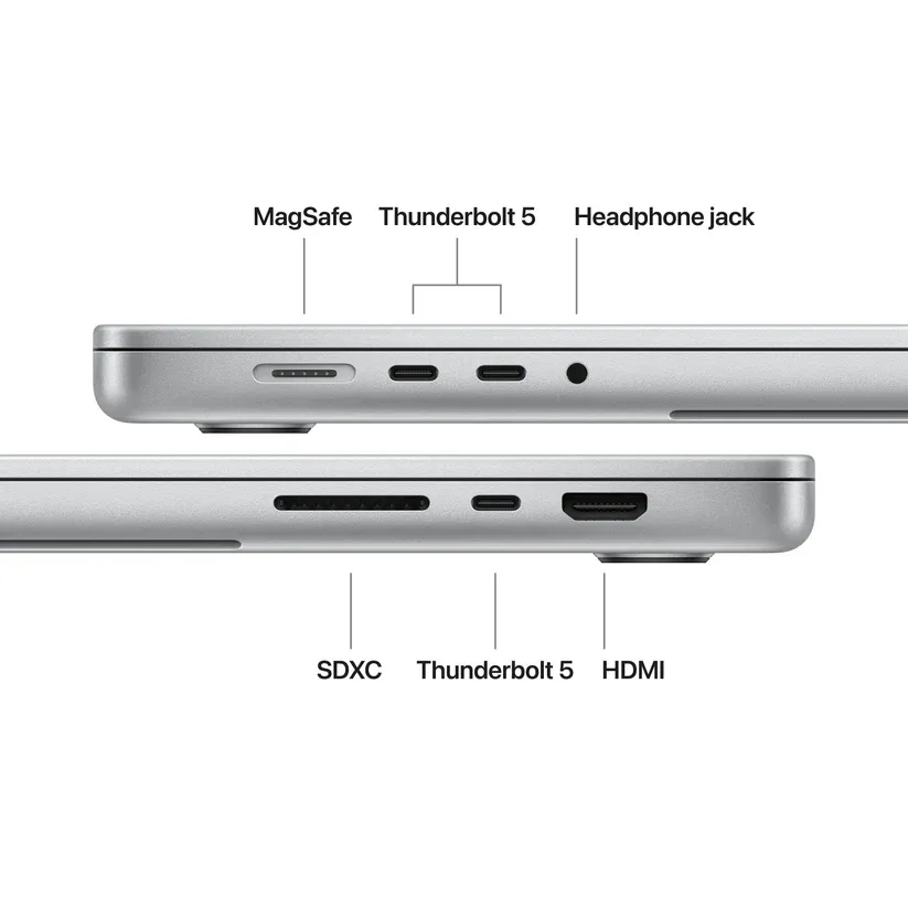 | Интерфейс: | HDMI 3.5 mm headphone jack 3 Thunderbolt 4 (USB-C) ports with support for: Charging, DisplayPort, Thunderbolt 5 (up to 120Gb/s), USB 4 (up to 120Gb/s); MagSafe 3 port |