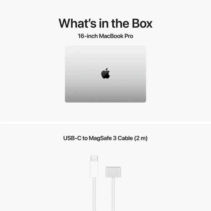 | Батерия: | 100-watt-hour lithium-polymer battery, Up to 24 hours video streaming, Up to 17 hours wireless web, USB-C to MagSafe 3 Cable (2 m), 140W USB-C Power Adapter |