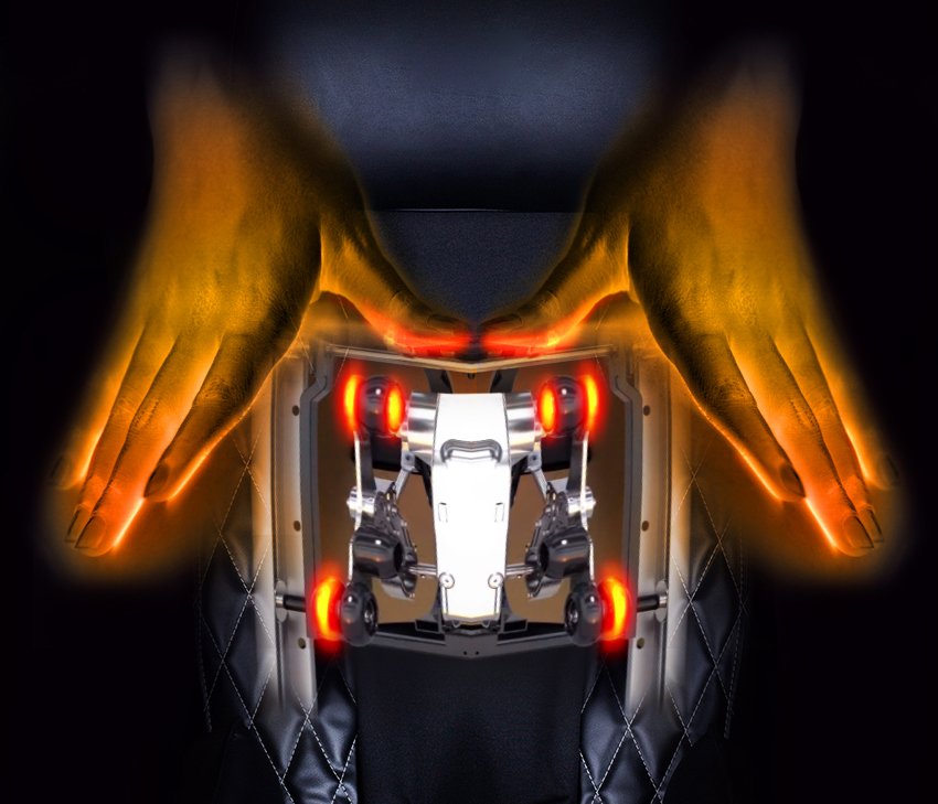 Чрез загряване на масажните ролки, столът предлага функцията термо-масаж, която успокоява мускулите и снабдява тялото с кислород, подобрявайки кръвообращението.
