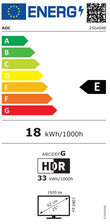 AOC 25G4SRE, 24.5"Fast IPS WLED, 1920x1080@300Hz (OC 310Hz), 1ms GtG, 0.3ms MPRT, 400cd m/2, 1000:1, 80M:1 DCR, Adaptive Sync, FlickerFree, Tilt, 2xHDMI, DP