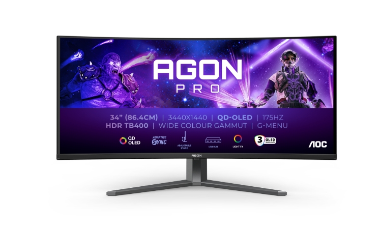 AOC AG346UCD, 34"Curved 1800R QD-OLED, 3440x1440@175Hz, 0.03msGtG, 1000 cd/m2, 1.5M:1, 80M:1DCR, Adaptive Sync, FlickerFree, Low Blue Light, 8Wx2, Tilt, Height Adjust, Swivel, 2xHDMI, DP, USB hub