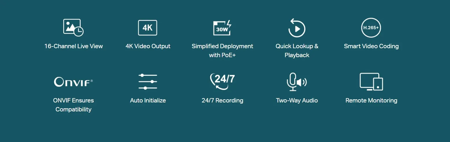 - 4K HDMI видео изход и 16MP капацитет за декодиране: Ясна дефиниция на изображението до 8MP и 8-ch@2MP капацитет за декодиране ви позволяват да се наслаждавате на повече канали на преглед на живо и възпроизвеждане едновременно.
