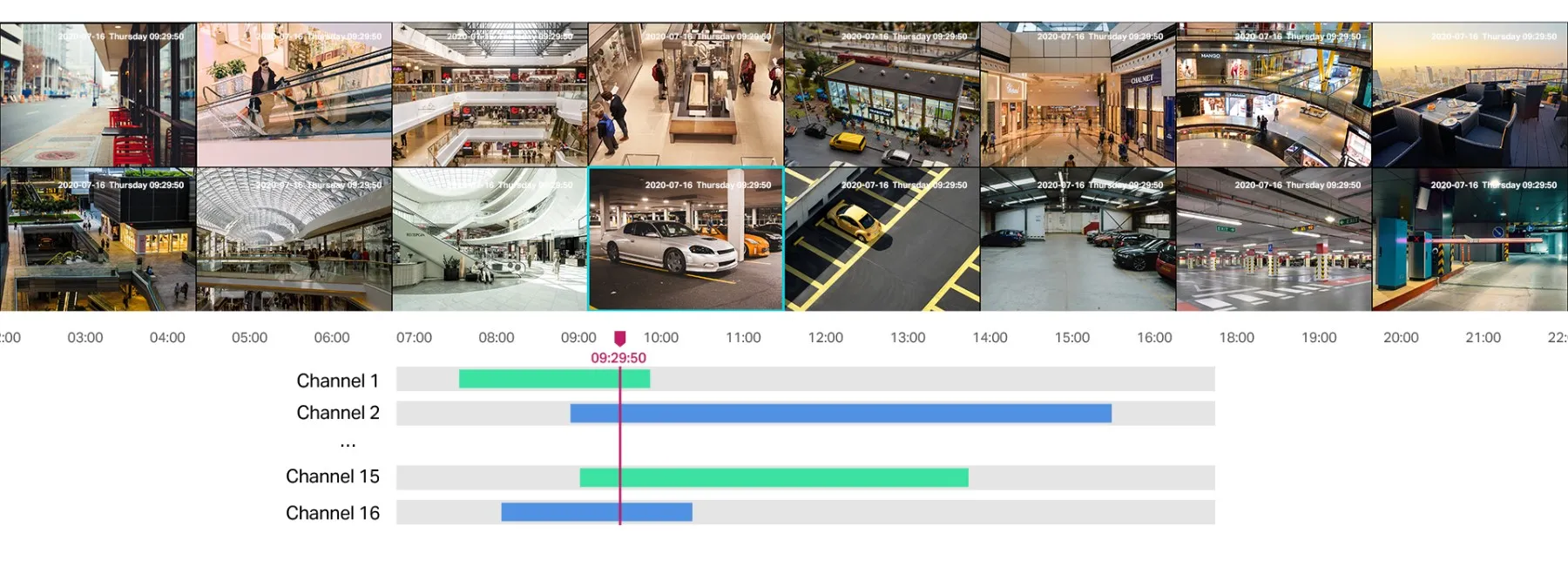 - 16-канално едновременно възпроизвеждане*: Възпроизвеждайте отново емисиите от до 16 камери едновременно, увеличете скоростта на възпроизвеждане и намерете събития във видео графика, за да преглеждате лесно заснетия материал.