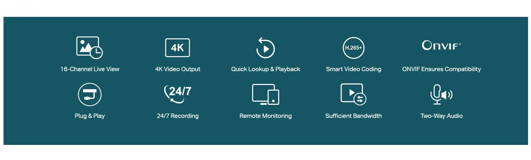 - 4K HDMI видео изход и 16MP капацитет за декодиране: Ясна дефиниция на изображението до 8MP и 8-ch@2MP капацитет за декодиране ви позволяват да се наслаждавате на повече канали на преглед на живо и възпроизвеждане едновременно.