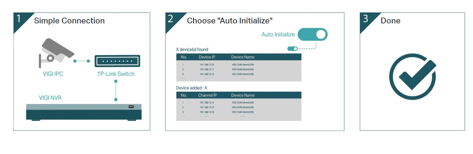Позволява автоматично добавяне на нови и неизползвани VIGI IP камери към новия NVR и незабавно активиране, което прави инсталирането по-бързо от всякога.