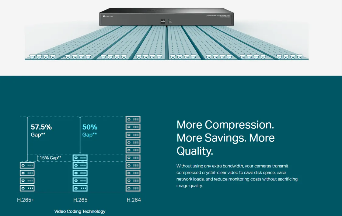 Високата честотна лента на видео достъп гарантира, че вашият NVR управлява повече камери с висока разделителна способност. Въз основа на лабораторни тестове с използване на VIGI камери, VIGI NVR може да управлява до 32 HD камери.