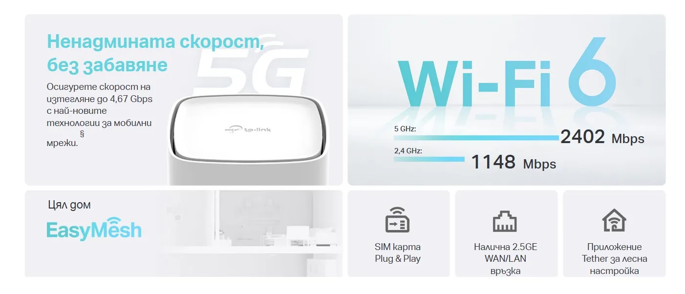 - Увеличете вашата 5G скорост - Възползвайте се от вашата усъвършенствана 5G мрежа със скорост на изтегляне до 4,67 Gbps. Споделете вашата 5G мрежа с множество Wi-Fi устройства и се насладете на Ultra HD филми без прекъсване, светкавично бързо изтегляне на файлове и плавни видео чатове и видеоконференции.