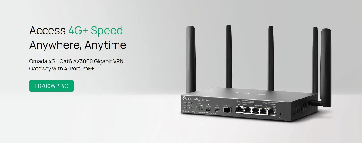 Гигабитен VPN рутер TP-Link Omada 4G+ Cat6 ER706WP-4G AX3000 4-портов PoE+