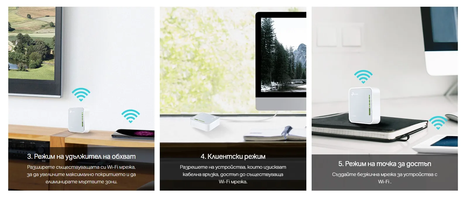 - Един превключвател за множество режими – Идеален за Wi-Fi у дома, в хотелската ви стая или на път.
