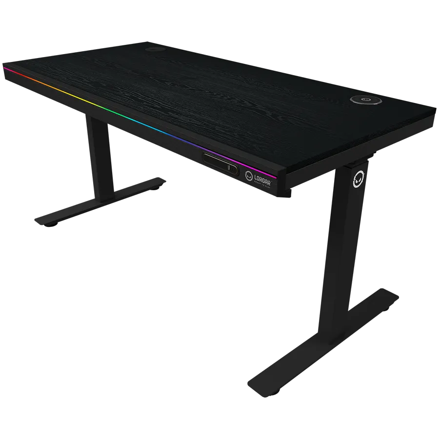 Геймърско бюро Lorgar PRO 80 Wooden, Dual-motor sit/stand adjustable-height gaming desk with wireless charger, RGB lighting, control panel, and USB ports, solid wooden tabletop, black. - LRG-DP80W