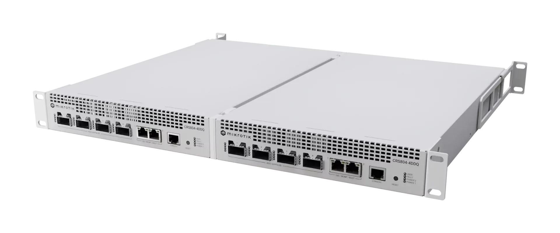 Компактен 1U 400G комутатор, проектиран за AI клъстери, сторидж мрежи и високоскоростна агрегация, оборудван с четири 400G QSFP56-DD порта, два 10 Gigabit Ethernet порта и RouterOS v7.
