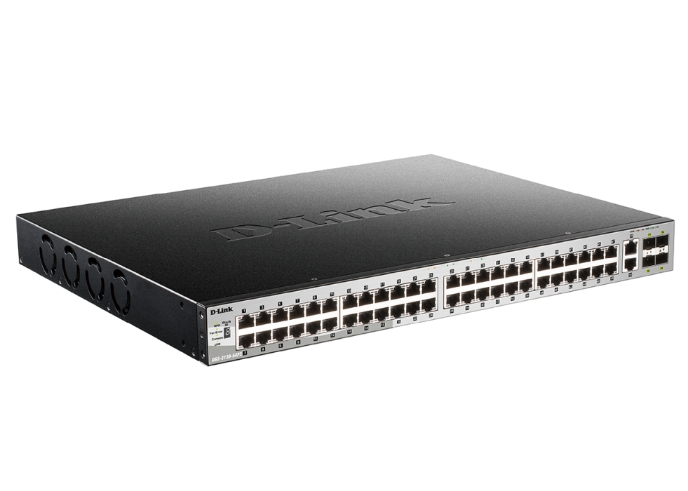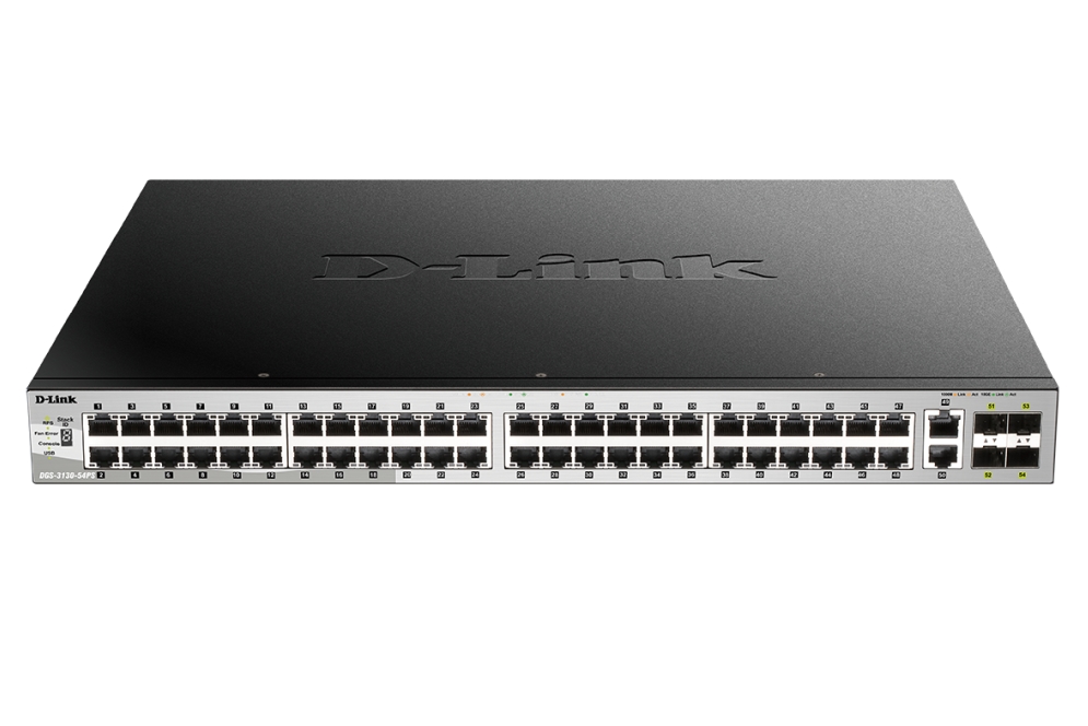 D-Link 48x10/100/1000BASE-T PoE ports (370W budget) Layer 3 Stackable Managed Gigabit Switch with 2x10GBASE-T ports and 4xSFP+ ports - DGS-3130-54PS