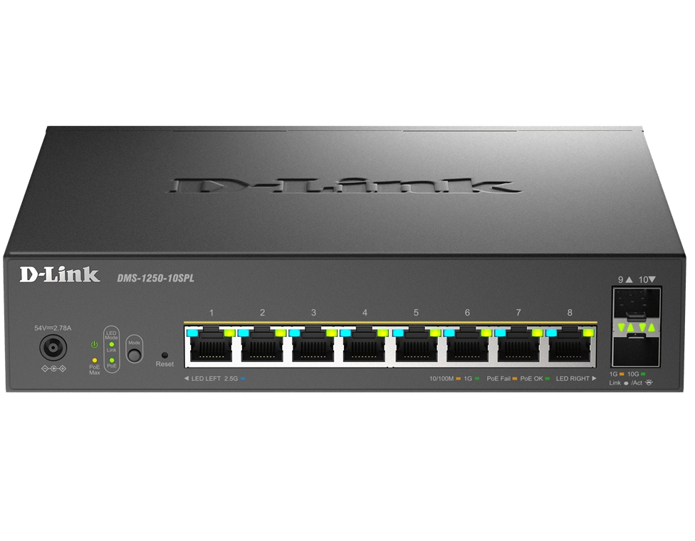 D-Link 8-Port 2.5G Base-T PoE, 2-port 10G SFP+ and 2x 10G RJ45 port Smart Managed Switch - DMS-1250-10SPL