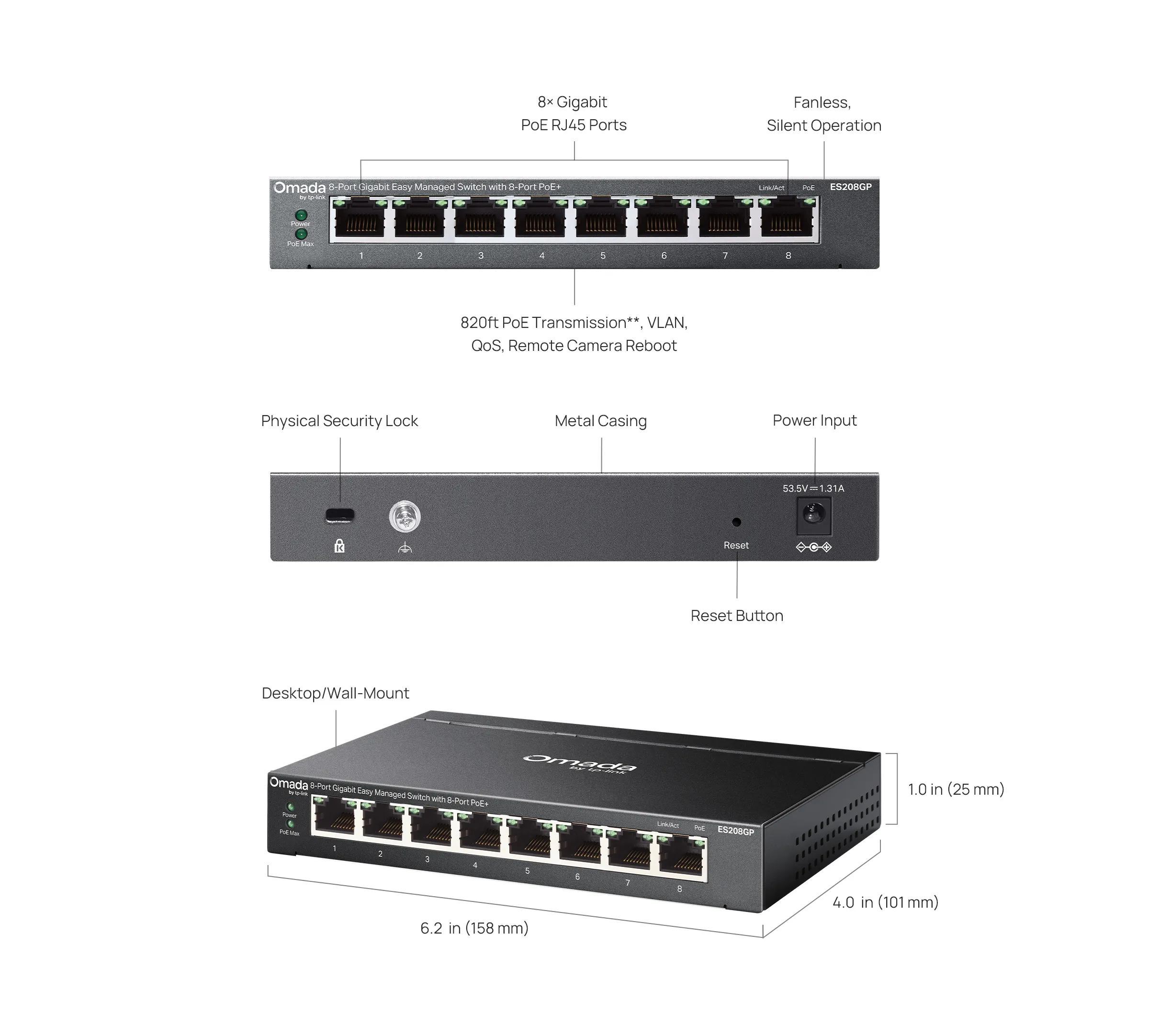 | Ethernet портове: | 8× 10/100/1000 Mbps PoE+ RJ45 Ports (support 802.3af PoE and 802.3at PoE+) |