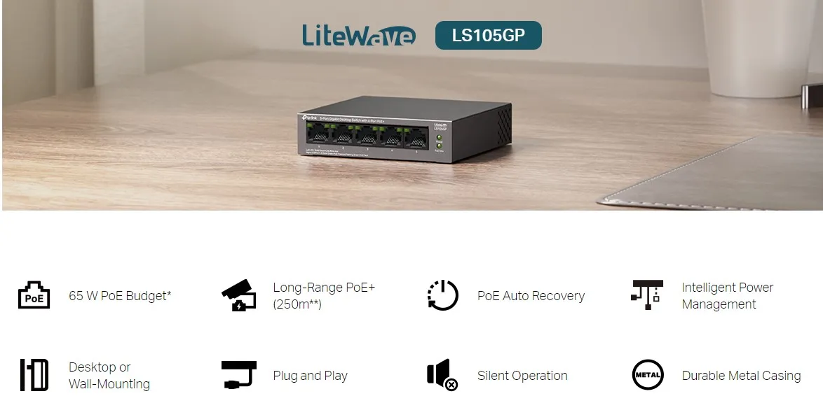 5-портов гигабитов комутатор TP-Link LS105GP с 4-порта PoE+