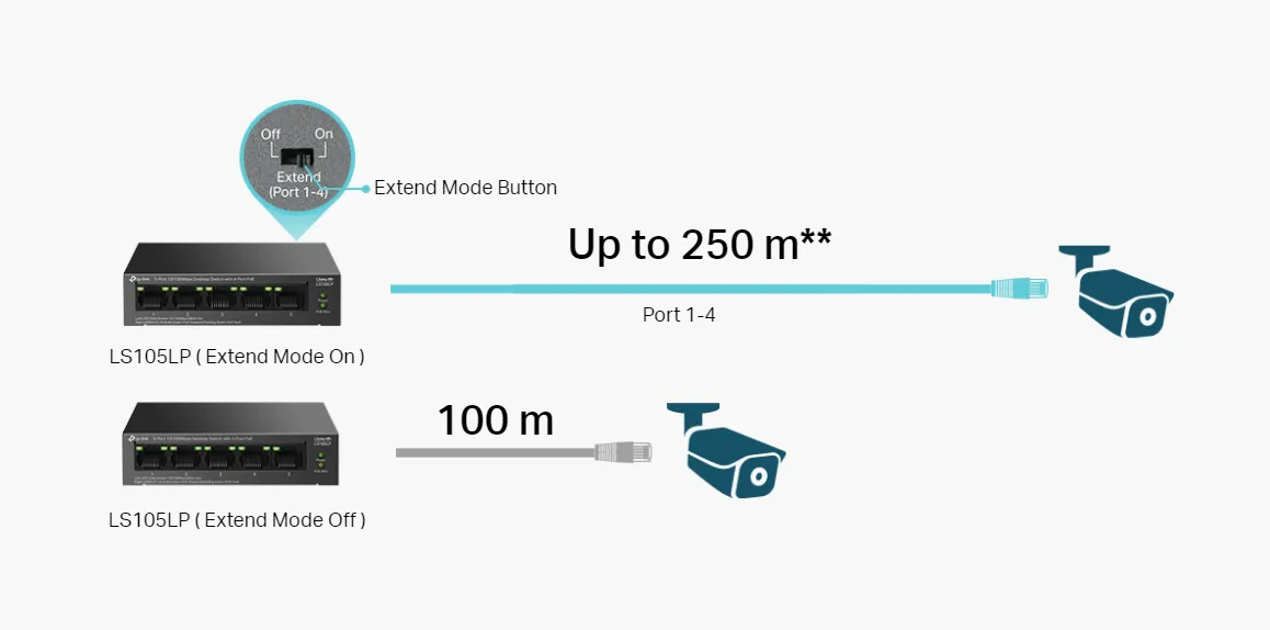 - До 250 m PoE предаване: С разширен режим разстоянието на PoE предаване достига до 250 m, идеално за разполагане на камери за наблюдение в големи райони.
