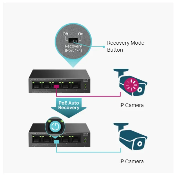 - PoE Auto Recovery: Автоматично рестартира вашите изпуснати или неотговарящи устройства, захранвани с PoE.